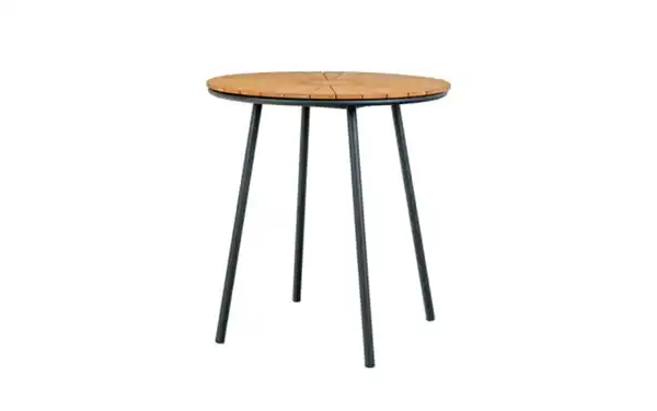 Zeitloser Bistrotisch mit Tischplatte aus Teakholz, wetterbeständig, Gestell aus Aluminium in Schwarz, rostfrei, platzsparendes Design auch für kleine Balkone geeignet,