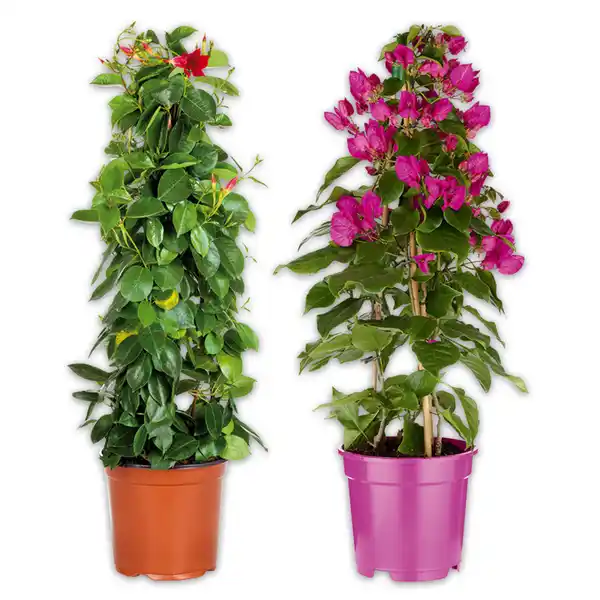 - in den Sorten z.B.: Canna blühend rot, gelb oder orange, Dipladenia rot, Bougainvillea "Vera Deep Purple" oder Passionsblume "Passiflora caerulea"