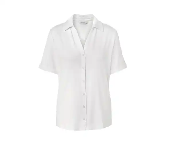 Blusenshirt mit Knopfleiste, weiß Farbe: Weiß Material: 95% Viskose, 5% Elasthan (Creora®) Maße: Gesamtlänge ca. 66,5 cm (Gr. M 40/42) Passform: Regular Fit Weich fließende Viskose-Stretch-QualitätVorderseite mit KnopfleisteV-Ausschnitt mit KragenFixierter ÄrmelumschlagAbgerundeter SaumMit Elasthan: formbeständig, perfekter Sitz, hoher TragekomfortDieses Blusenshirt beinhaltet Fasern aus nachhaltigem Holz.