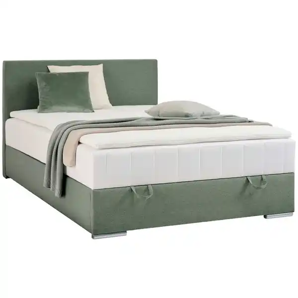 Schaffen Sie einen Ruhebereich, der zum Träumen einlädt, mit diesem Boxxx Boxbett (Liegefläche: ca. 140 x 200 cm) in Grün inklusive Bettkasten. Wichtige Maße und technische Details Liegefläche: ca. 140 x 200 cm (B x L) Gesamtmaße: ca. 141 x 216 x 98 cm (B x L x H) Liegehöhe: ca. 57 cm Komforthöhe Boxhöhe: ca. 27 cm Matratzenhöhe: ca. 22 cm Topperhöhe: ca. 5 cm Kopfteil: ca. 141 x 98 cm (B x H) Fußhöhe: ca. 3 cm Die Basis der Komforthöhe, die es ermöglicht, mit Leichtigkeit ins sowie aus dem Bett zu kommen, bildet eine Unterbox. Der Bonellfederkern der durchgehenden Matratze besteht aus taillierten Federn, die oben beziehungsweise unten breiter sowie über Spiraldraht miteinander verbunden sind. Dadurch wird eine gute Luftzirkulation und angenehme Flächenelastizität gewährt. Profitieren Sie von einem festen Härtegrad: empfehlenswert für Personen ab ca. 80 kg. Als oberste Lage im Aufbau trägt der durchgehende Schaumstoffkern-Topper maßgeblich zur Vollendung des Entspannungskonzepts bei – der Synthetikfaser-Bezug ist für hygienische Frische von Hand waschbar. Ein modernes Ambiente im Schlafbereich wird von dem mit einem Synthetikfaser-Bezug (100 % Polyester) gefertigten Bett mit seiner gelassenen Farbgebung in Grün kreiert. Die glatte Webstoff-Oberfläche hat eine feine, ebenmäßige Textur, die gleichermaßen weich und gemütlich ist. Ankommen, zurücklehnen, ausspannen: Das gepolsterte Kopfteil ist wie gemacht für den ruhigen Feierabend. Der Bettkasten hält praktischen Stauraum für allerlei Wohnaccessoires bereit. Realisieren Sie ein gemütliches Schlafzimmer-Upgrade mit diesem Boxbett (ca. 140 x 200 cm) in Grün inklusive Bettkasten, Matratze, Topper und gepolstertem Kopfteil – weil Qualität und Ästh