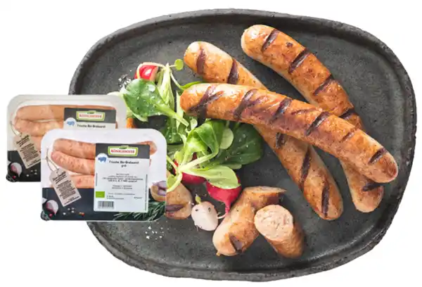 2 Sorten: Grobe Bratwürste oder Bärlauch-Bratwürste aus Schweinefleisch, Herkunft siehe Etikett, je 4 Stück