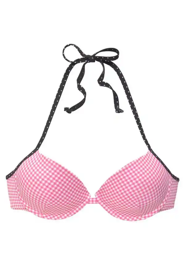 Oh, là, là! Das Push-up-Top von Buffalo setzt auf den angesagten Vichy-Trend und wird damit zu einem Must-have. Neben dem karierten Design sorgen gepunktete Nackenträger für einen schönen Kontrast. Durch die herausnehmbaren Kissen formt dir das Bikini-Oberteil ein schönes Dekolleté. Das elastische und gefütterte Material sorgt für jede Menge Komfort. Praktisch: Dank des Verschlusses am Rücken kannst du das Modell unkompliziert an- und ausziehen. Kombinieren lässt es sich ebenfalls supereinfach zu unifarbenen, karierten oder gepunkteten Bikini-Höschen. Bademode mit einer großen Portion Charme: das Push-up-Top von Buffalo! Obermaterial aus 80% Polyamid, 20% Elasthan (LYCRA®). Futter aus 100% Polyester.
