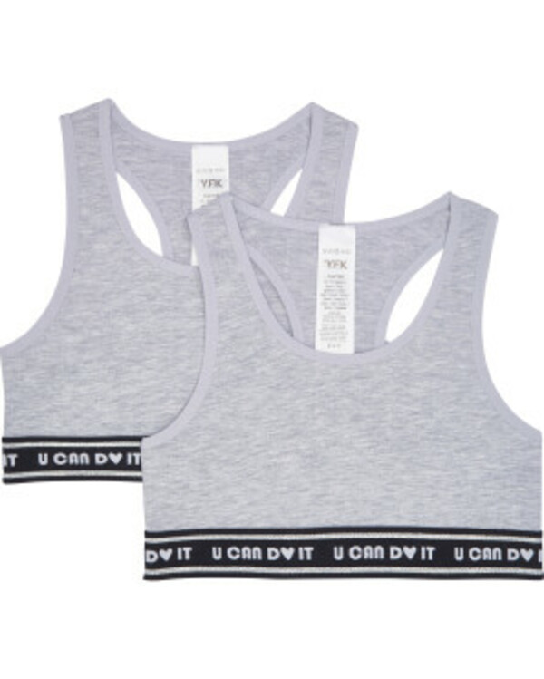 Rundhalsausschnitt Ringerneck Unterbrustgummi mit Glitzer und Schriftzügen 2er-Pack Produktnummer 1170748 Material Schwarz) Oberstoff und BH-Futter: 95 % Baumwolle, 5 % Elasthan Grau Melange) Oberstoff und BH-Futter: 55 % Baumwolle, 40 % Polyester, 5 % Elasthan