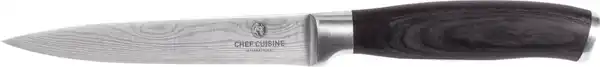 Aus strapazierfähigem Klingenstahl > Geschmiedete, eisgehärtete Klinge > Von Hand geschliffen und poliert > Gelaserte Oberfläche in Damast-Optik > Klingenlänge ca. 13 cm > Griff aus Pakkaholz und Edelstahl