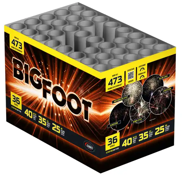 Mit Feuersternen, Blumen- und Brokateffekt > Mehrschlagsalve aus Knisterfeuertopf > Falling-leaves-Effekt > 3-fach-Fächersalve > Finale mit Knisterwolkeneffekt > Effektmenge ca. 473 g > 36 Schuss > Kaliber bis Ø 25 mm > Effekthöhe ca. 40 m > Brenndauer ca. 35 sec