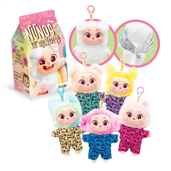 Nunos Plüschfiguren-Kollektion – enthält 6 verschiedene Charaktere. Müller exclusiv. Jeder hat weiches Fell in verschiedenen Farben. Die fünf regulären Charaktere tragen ein Hemd und eine Hose in derselben Farbe, verziert mit einem speziellen Muster. Der super rare Charakter hat ein Paar magische Flügel.