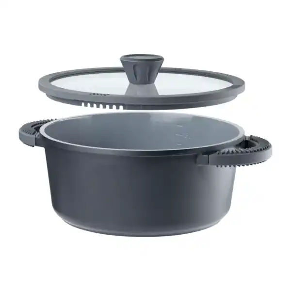 Aluguss, rutschfeste Silikongriffe; Deckel mit Daumen-Auflage und 2 Abgießöffnungen; spülmaschinengeeignet; für alle Herdarten, inkl. Induktion; Volumen: ca. 6,8 L; Ø: ca. 28 cm