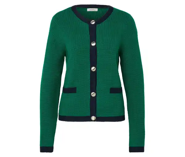 Cardigan aus Strukturstrick Farbe: Grün mit dunkelblauen Details Material: 52% Viskose, 27% Polyester, 21% Polyamid Maße: Gesamtlänge ca. 58 cm (Gr. M 40/42) Passform: Regular Fit Weiche Qualität mit hohem ViskoseanteilVerkürzte PassformRundhalsausschnittMit Knopfleiste2 aufgesetzte Taschen