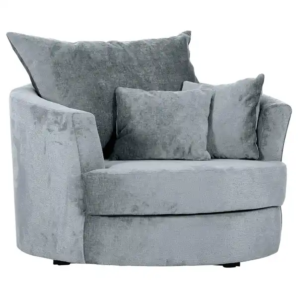 Kuschelige Auszeiten sind auf Ihrem Carryhome Sessel in Hellblau gesichert. Wichtige Details auf einen Blick: B x H x T: ca. 115 x 72 x 115 cm Sitzfläche: ca. 68 x 68 cm (B x T), Sitzhöhe: ca. 45 cm maximale Belastbarkeit: ca. 120 kg Fußhöhe: ca. 6 cm Armlehnenhöhe: ca. 65 cm Rückenkissen: ca. 90 x 20 x 60 cm (L x B x H) Zierkissen: ca. 40 x 40 cm (L x B) Erlebbare Gemütlichkeit Das widerstandsfähige Material macht den Synthetikfaser-Bezug (ca. 100 % Polyester) zu einer guten Wahl. Die Chenille-Oberfläche beeindruckt dabei mit ihrer samtigen Erscheinung. Zudem weist der Stoff eine gute Lichtechtheit sowie eine sehr gute Abriebfestigkeit auf. Die Sitzgelegenheit soll frei im Raum stehend präsentiert werden? Dank des echt bezogenen Rückens ist dies möglich. Eine bequeme Schaumstoff-Polsterung mit Wellenunterfederung, die zu tiefes Einsinken verhindert, unterstützt den Körper und führt Komfort herbei. Luftdurchlässig, belastbar und formstabil verhält sich der wärmeisolierende Polyetherschaumkern. Trotz dessen hoher Punktelastizität dürfen Sie sich über ein eher legeres Sitzgefühl freuen. Sehenswerter Hingucker Das Möbel betont mit seinem sanften Kolorit in Hellblau ein geschmackvolles Ambiente. Das Design fußt insgesamt auf einem 360-Grad-Drehgestell aus lackiertem Eisen in Schwarz, auf dem die Bewegungsfreiheit die beabsichtigte Wendung nimmt. Im Lieferumfang enthalten: Rückenkissen (Füllung: Polyester / Schaumstoffflocken) Zierkissen (Füllung: Polyester / Schaumstoffflocken) Drehfunktion (360 Grad) echt bezogener Rücken Genießen Sie Ihr Rendezvous mit der wohligen Unbeschwertheit des Seins auf diesem hellblauen Sesse