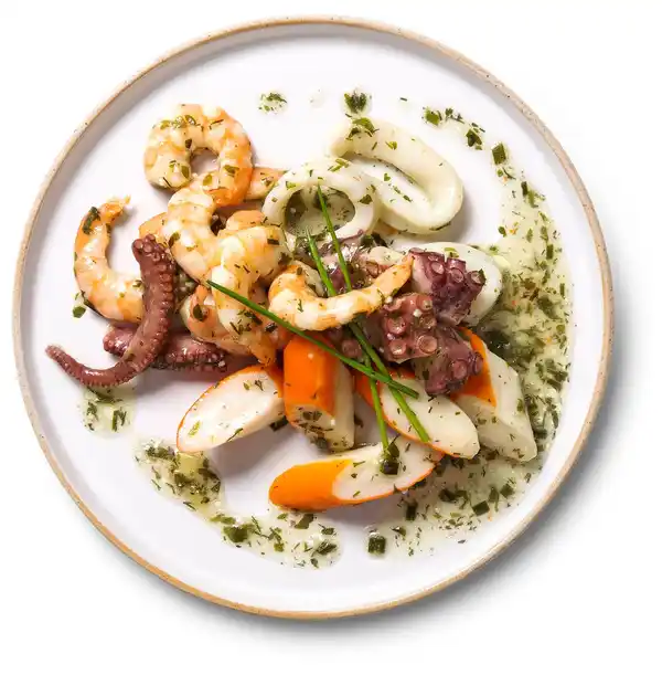 Tintenfisch, Riesengarnelen und Surimi, verfeinert mit Kräuterdressing