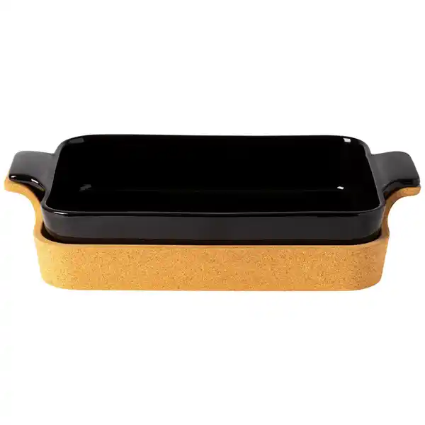Costa Nova Auflaufform Ensemble, Schwarz Hochglanz, Braun, Keramik, Holz, Kork, rechteckig, 40x8x26 cm, Handmade in Europe, backofengeeignet, Kochen, Auflaufformen