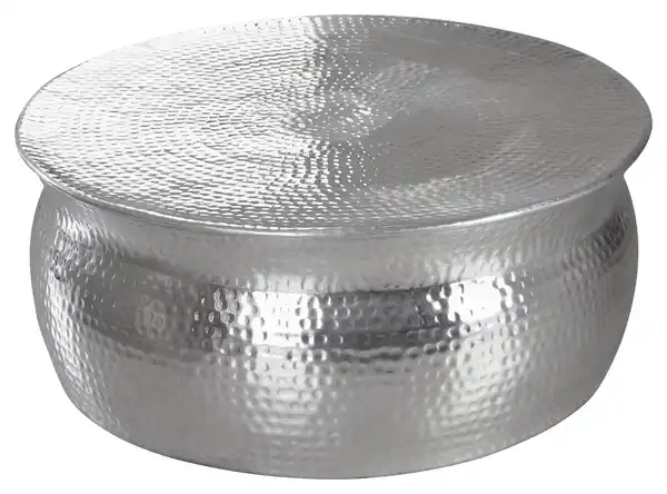 Dieser Couchtisch in Silberfarbe bringt einen Hauch von Orient in Ihre Wohnräume und ist mit seiner extravaganten Optik ganz sicher ein Blickfang für Ihr Zuhause. Der runde Couchtisch aus getriebenem und poliertem Aluminium hat einen Durchmesser von ca. 75 cm und eine Höhe von ca. 31 cm. Er ist bis max. 20 kg belastbar und bietet Ihnen eine flexible Ablagemöglichkeit mit individuellem Stil und Charakter. HINWEIS Dieser Artikel wird in unseren Filialen nicht ausgestellt, ist dort jedoch einfach und bequem bestellbar und wird direkt zu Ihnen nach Hause geliefert. Bitte beachten Sie, dass die abgebildete Dekoration im Lieferumfang nicht enthalten ist.