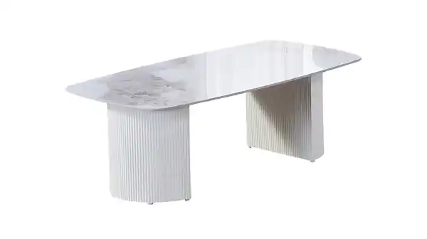 Der Couchtisch VITALO bringt mit seiner rechteckigen Tischplatte in edler weißer Marmoroptik eine ruhige und gleichzeitig luxuriöse Atmosphäre in Ihren Wohnraum. Die Maserungen der Marmoroptik bringen dezente Farbe in das Design und fügen sich dennoch perfekt in das helle, elegante Gesamtbild des Couchtischs ein. Die weißen Standbeine in moderner Säulenform entfalten durch ihre Lamellenstruktur eine dreidimensionale Tiefe. Hierdurch erhält der Couchtisch VITALO eine fast skulpturale Erscheinung, wodurch er sowohl in moderne, als auch klassische Einrichtungsstile passt.
