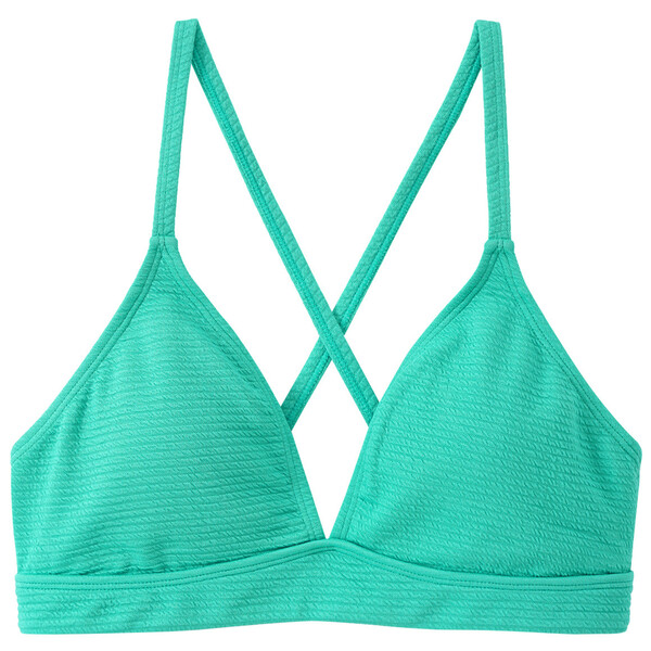 Einfach mal abtauchen! Türkises Bikinioberteil aus strukturiertem Material im Triangle-Style. Tief ausgeschnitten mit wattierten Cups und im Rücken gekreuzten Spaghettiträgern. Clipverschluss im Rücken. Komplett gefüttert.
