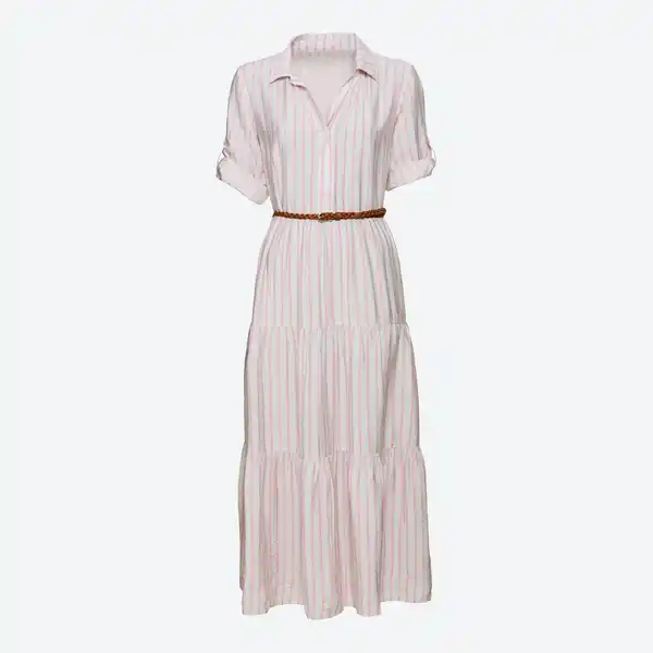 Dieses Damen-Kleid von Laura Torelli Collection überzeugt mit seinem wadenlangen, gestreiften Design und einem passenden Gürtel. Das Modell ist mit einer durchgehenden Knopfleiste und einem eleganten V-Ausschnitt gestaltet. Die Ärmel lassen sich praktisch hochkrempeln und durch einen Knopf auf Ellenbogenhöhe fixieren. So vereint dieses Kleid modischen Chic und hohen Tragekomfort – ideal für verschiedene Anlässe und den Alltag. Wadenlanges gestreiftes Design mit Gürtel V-Ausschnitt sorgt für femininen Look Praktische Knopfleiste im Frontbereich Ärmel können hochgekrempelt werden Materialmix aus Viskose und Polyamid