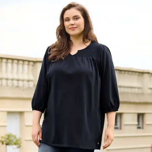 Dieses Damen-Langarmshirt von Laura Torelli Plus mit 3/4-Ärmeln überzeugt durch stilvolle Details wie einen V-förmigen Schlitz am Ausschnitt, Raffungen an Schulter und Vorderseite sowie eine gesmokte Passe. Das reine Baumwollmaterial sorgt für ein angenehmes Tragegefühl und macht das Langarmshirt ideal für verschiedene Anlässe. Modernes Design mit V-Schlitz am Ausschnitt Raffungen an Schulter und Vorderseite Smock-Detail an der vorderen Passe 3/4-Arm mit elastischen Abschlüssen Reine Baumwolle für angenehmen Komfort