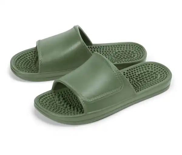 Damen-Massage-Pantoletten Farbe: Dunkelgrün Material: 100% Ethylenvinylacetat Für die tägliche Fußmassage zu HauseKann die Fußreflexzonen massierenKann für inneres Gleichgewicht sorgenIn den Größen 36/37, 38/39 und 40/41 erhältlich