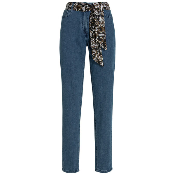 Echter Sommer-Style! Blaue Mom-Jeans im Five-Pocket-Style mit Knopf und Reißverschluss schließbar. Mit fünf Gürtelschlaufen und passendem Bindegürtel mit Paisley-Muster. Lockerer und gerader Schnitt.