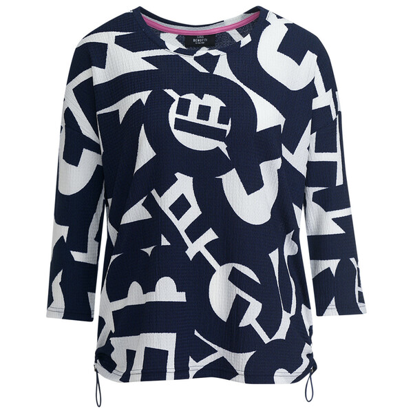 Besonders schön! Dunkelblaues Shirt mit weicher Viskose und grafischem Allover-Print in Weiß. Mit Rundhalsausschnitt, leicht überschnittenen Schultern und Ärmeln in 3/4-Länge. Saum abgerundet und seitlich zum Raffen mit Stoppertunnelzug.