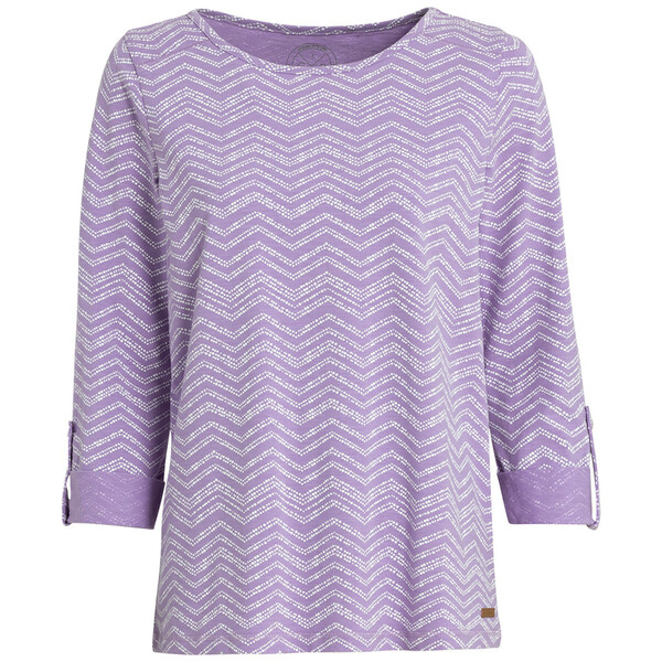 Ganz schön auf zack! Meliertes Shirt in Flieder mit gezacktem Muster in Weiß im Allover-Dessin. Mit paspeliertem Rundhalsausschnitt und Turn-up-Ärmeln. Kleine Applikation aus Lederimitat am Saum und gerade Passform. Cotton made in Africa setzt sich für einen ökonomisch, sozial und ökologisch nachhaltigeren Baumwollanbau in Subsahara-Afrika ein und trägt damit zu einer Verbesserung der Lebensbedingungen kleinbäuerlicher Familien bei.