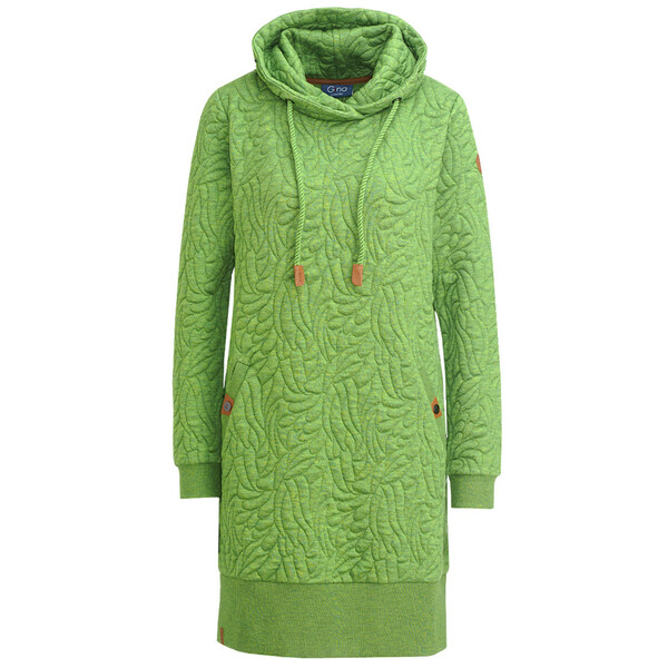 Schöne Details! Grün meliertes Kleid aus strukturiertem Sweat mit Tunnelzug am Schalkragen. Zwei Einschubtaschen auf der Front und Rippenbündchen an den Armausschnitten sowie am Saum. Mit verschiedenen Details aus Lederimitat.