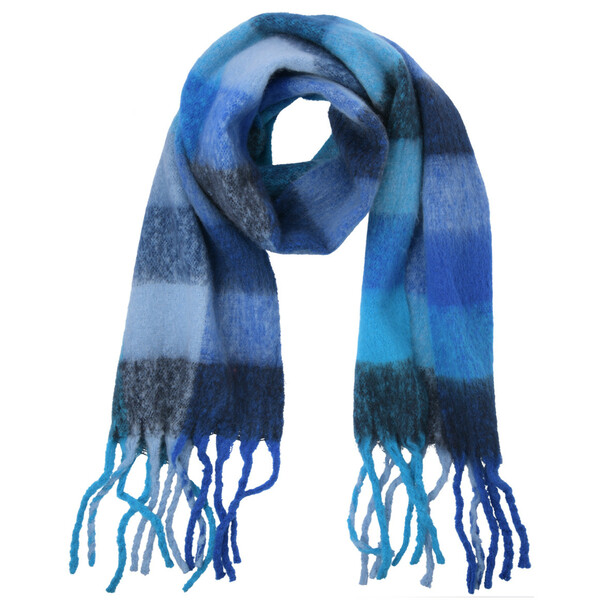 Kuschelig durch den Herbst! Volumiger Schal mit bunt kariertem Muster in Blau, Dunkelblau und Türkis. Mit langen Fransen an den Enden und in sehr flauschiger und weicher Qualität. Maße (mit Fransen) ca. 240 x 40 cm (LxB).