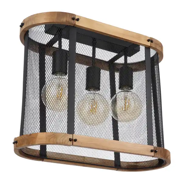 Diese trendige Deckenleuchte aus Metall und Holz sorgt für stimmungsvolle Beleuchtung in Ihrem Zuhause und ist zugleich ein attraktiver Blickfang im Industry-Stil. Die Materialkombination und die markante Optik zeichnen diese tolle Deckenleuchte in Schwarz und Dunkelbraun aus. Die ca. 45 x 20 x 38 cm (L x B x H) große 3-flammige Deckenleuchte in Netzoptik und mit zwei stabilen Holzbögen ist für 3 Leuchtmittel E27 mit einer max. Leistung von je 40 Watt ausgelegt. Passende Leuchtmittel der Energieeffizienzklasse A bis G finden Sie in unserem Onlineshop. HINWEIS Dieser Artikel wird in unseren Filialen nicht ausgestellt, ist dort jedoch einfach und bequem bestellbar und wird direkt zu Ihnen nach Hause geliefert. Bitte beachten Sie, dass die abgebildete Dekoration im Lieferumfang nicht enthalten ist.
