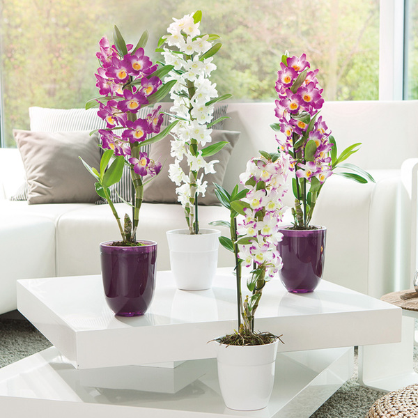 ### Dendrobium nobile - **die besondere Dendrobium Art** - in den Farben z.B.: weiß, violett, rosa oder violett/weiß - Höhe ca. 55 – 70 cm inkl. 12-cm-Kulturtopf (ohne Übertopf) je Pflanze