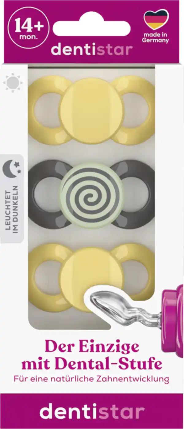 - Größe 3 (ab 14 Monaten): Der Sauger ist speziell auf dieses Alter abgestimmt. Um Zahnfehlstellungen zu verhindern, sollte unbedingt auf die Wahl der richtigen Größen geeignet werden. Denn nicht umsonst wurde der Dentistar Schnuller als einziger von der Aktion Zahnfreundlich ausgezeichnet.