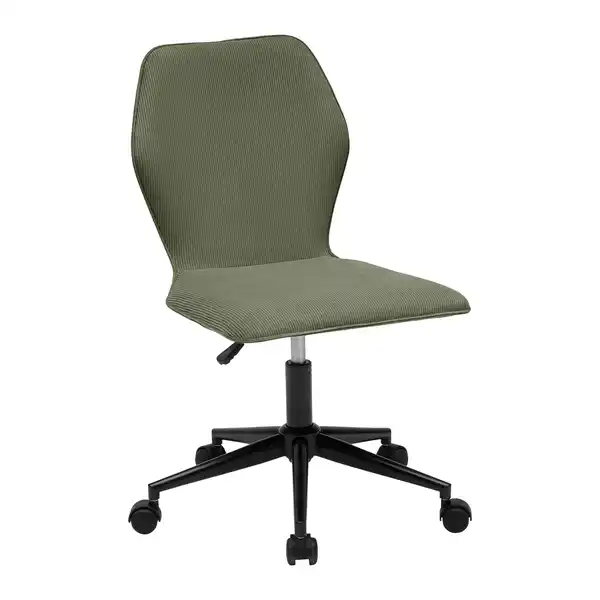 Der Drehstuhl Luigi in modernem Grün und Schwarz vereint zeitgemäßen Stil mit praktischer Funktionalität und ist die perfekte Ergänzung für jeden Arbeitsplatz oder Schreibtisch. Mit seinen Maßen von ca. 49/84 x 94/54 cm (B x H x T) bietet der Stuhl optimalen Komfort und überzeugt durch seine vielseitige Verstellbarkeit. Die Sitzfläche mit einer Sitzbreite von ca. 48 cm, einer höhenverstellbaren Sitzhöhe von ca. 42-52 cm und einer Sitztiefe von ca. 43 cm ist mit trendigem Cordstoff in Grün bezogen. Das Innenleben aus Schaumstoff sorgt für ein angenehmes Sitzgefühl, auch bei längerer Nutzung. Der Stoff verleiht dem Stuhl zudem einen modernen und harmonischen Look, der sich nahtlos in verschiedene Einrichtungsstile einfügt. Der Drehstuhl verfügt über eine drehbare Sitzfläche und ein höhenverstellbares Gaslift-System, das eine ergonomische Anpassung an Ihre Sitzhaltung ermöglicht. Die robuste Beinform mit Drehkreuz ist mit 5 Universalrollen ausgestattet, die müheloses Gleiten auf verschiedenen Bodenarten ermöglichen. Mit einer Maximalbelastbarkeit von ca. 140 kg und einer variablen Gesamthöhe zwischen ca. 84 cm und 94 cm bietet der Drehstuhl Stabilität und Komfort in einem stilvollen Design. Der Drehstuhl Luigi verbindet Funktionalität mit Ästhetik und ist der ideale Begleiter für produktive Stunden am Schreibtisch – ein Must-have für modernes Wohnen und Arbeiten!
