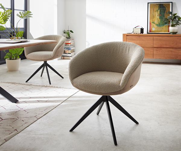 Wie ein weiches Nest ohne störende Nähte sorgt der Esszimmerstuhl Vinka für eine einladend gemütliche Atmosphäre in jedem Esszimmer. Sein kompaktes Design mit niedriger Rückenlehne macht den Stuhl perfekt auch für kleinere Räumlichkeiten. Der Stuhl wurde besonders dick gepolstert und schenkt durch die Verwendung von hochwertigem Taschenfederkern unvergleichlichen Sitzkomfort.Ein außergewöhnlicher Materialmix aus Mikrofaser an der Außen- und Strukturstoff in Bouclé Optik an der Innenseite schenkt dem Esszimmerstuhl einen außergewöhnlichen Look. Ob als Einzelstück oder als Sitzgruppe - die Verwendung von zwei Materialien macht ihn zum Design-Highlight. Vinka-Flex macht Sitzen zum VergnügenDas breite Kreuzgestell sorgt für sicheren Stand und lässt sich um 360 Grad drehen.Durch das aufwendige Verfahren der Pulverbeschichtung entsteht eine sehr regelmäßige Oberfläche, die besonders robust und widerstandsfähig gegen Kratzer und Beschädigungen ist. Dadurch lässt sich das Gestell einfach reinigen und bleibt lange schön. Maße ca.: B69 x T63 x H79 cm Sitzbreite ca.: 43 cm Sitztiefe ca.: 46 cm Sitzhöhe ca.: 49 cm Rückenhöhe ca.: 35 cm Armlehnenhöhe ca.: : 70 cm Materialen: Sitzschale: Mikrofaser (100% Polyester), Bouclé (100% Polyester), Stuhlgestell: pulverbeschichtetes Metall Farbe: Sitzschale: Schlamm Vintage / Schlamm, Stuhlgestell: Schwarz Polsterung: Taschenfederkern mit hochwertiger Schaumabdeckung RG 40/60 Oberfläche: Soft Montagehinweis: teilmontiert, die Einzelelemente müssen miteinander verbunden werden Gewicht in kg: 11 Auf Grund hochwertiger Verarbeitung belastbar bis 125 Kg Beim Taschenfederkern werden einzelne Federkerne in Taschen vernäht. Sie sind im Gegensatz zu anderen Federungen nicht miteinander verbunden und geben deshalb nur bei den Federn nach, die tatsächlich auch belastet werden. So bietet dieser Sitzaufbau eine punktelastische Unterstützung beim Sitzen, während die Wirbelsäule entlastet wird. Der Taschenfederkern ist mit einem formstabilen Schaum mit 40er Raumgewicht und einer exzellenten Stauchhärte extrem hochwertig und langlebig. Mit unseren Design-Möbeln mit Taschenfederkern kannst du gesunden Sitzkomfort ganz entspannt genießen.