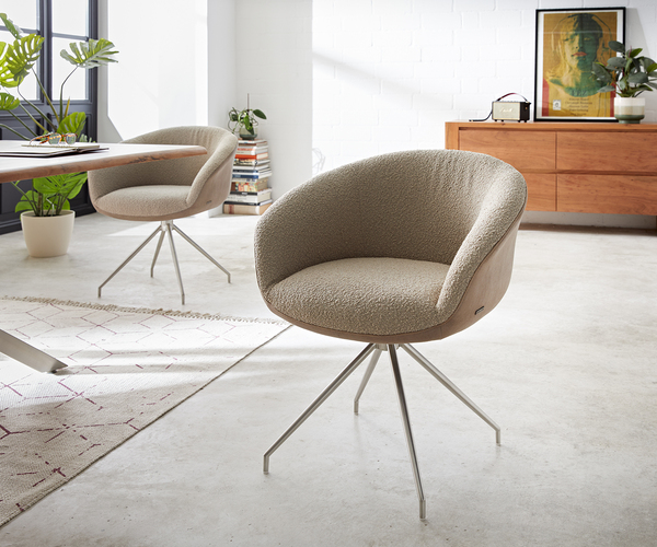 Wie ein weiches Nest ohne störende Nähte sorgt der Esszimmerstuhl Vinka für eine einladend gemütliche Atmosphäre in jedem Esszimmer. Sein kompaktes Design mit niedriger Rückenlehne macht den Stuhl perfekt auch für kleinere Räumlichkeiten. Der Stuhl wurde besonders dick gepolstert und schenkt durch die Verwendung von hochwertigem Taschenfederkern unvergleichlichen Sitzkomfort.Ein außergewöhnlicher Materialmix aus Mikrofaser an der Außen- und Strukturstoff in Bouclé Optik an der Innenseite schenkt dem Esszimmerstuhl einen außergewöhnlichen Look. Ob als Einzelstück oder als Sitzgruppe - die Verwendung von zwei Materialien macht ihn zum Design-Highlight. Vinka-Flex macht Sitzen zum VergnügenDas Kreuzgestell überzeugt durch sein einmaliges Design. Vier Füße verlaufen in sanft konischer Form und knicken dramatisch zum Boden hin ab. Das sieht nicht nur aufregend gut aus, sondern sorgt für besonders sicheren Stand. Das Kreuzgestell verfügt über eine zusätzliche Drehfunktion inkl. Rückholfunktion von 180 Grad und macht diesen Stuhl deshalb herrlich praktisch und komfortabel.Das Stuhlgestell wurde aus hochwertigem, handgebürstetem Edelstahl hergestellt. Durch das Bürstenverfahren glänzt das Gestell in edler Optik und ist besonders widerstandsfähig gegen Rost und Verschleiß. Maße ca.: B69 x T63 x H79 cm Sitzbreite ca.: 43 cm Sitztiefe ca.: 46 cm Sitzhöhe ca.: 48 cm Rückenhöhe ca.: 35 cm Armlehnenhöhe ca.: : 68 cm Materialen: Sitzschale: Mikrofaser (100% Polyester), Bouclé (100% Polyester), Stuhlgestell: Edelstahl gebürstet Farbe: Sitzschale: Schlamm Vintage / Schlamm, Stuhlgestell: Silber Polsterung: Taschenfederkern mit hochwertiger Schaumabdeckung RG 40/60 Oberfläche: Soft Montagehinweis: teilmontiert, die Einzelelemente müssen miteinander verbunden werden Gewicht in kg: 11 Auf Grund hochwertiger Verarbeitung belastbar bis 125 Kg Beim Taschenfederkern werden einzelne Federkerne in Taschen vernäht. Sie sind im Gegensatz zu anderen Federungen nicht miteinander verbunden und geben deshalb nur bei den Federn nach, die tatsächlich auch belastet werden. So bietet dieser Sitzaufbau eine punktelastische Unterstützung beim Sitzen, während die Wirbelsäule entlastet wird. Der Taschenfederkern ist mit einem formstabilen Schaum mit 40er Raumgewicht und einer exzellenten Stauchhärte extrem hochwertig und langlebig. Mit unseren Design-Möbeln mit Taschenfederkern kannst du gesunden Sitzkomfort ganz entspannt genießen.
