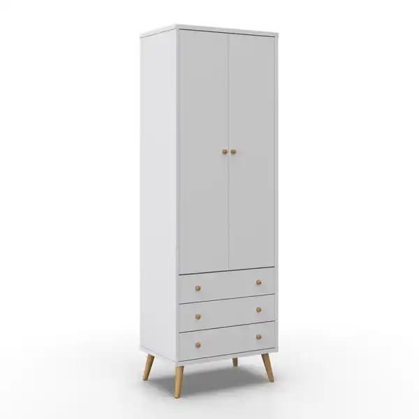 Dieser hochwertige Kleiderschrank in Weiß überzeugt mit einem zeitlosen Design und funktionaler Ausstattung – ideal für Schlafzimmer, Gästezimmer oder den Flur. Mit kompakten Maßen von ca. 60 cm Breite, 180 cm Höhe und 40 cm Tiefe eignet sich der Schrank besonders gut für kleinere Räume oder als Ergänzung zu bestehenden Möbeln. Produktmerkmale im Überblick: Maße: ca. 60 x 180 x 40 cm (B/H/T) Farbe: Korpus, Türen, Schubladenfront – klassisch Weiß Material: Kombination aus massivem Echtholz, MDF-Nachbildung und hochwertigem Aluminium Griffe: Runde Knopfgriffe aus naturfarbenem Holz – ein stilvoller Akzent Türart: Drehtür für schnellen Zugriff auf den Innenraum Innenausstattung:
