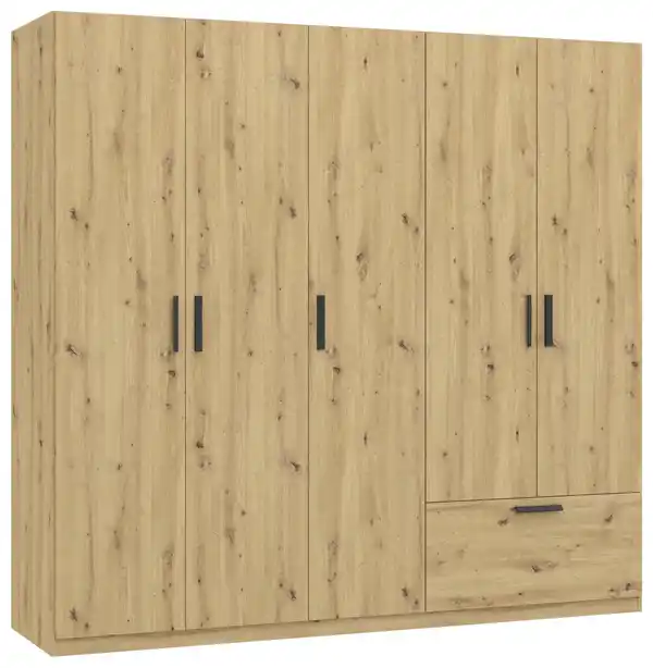 Sie lieben Ordnung und stilvolles Design? Dann ist der Drehtürenschrank MILOS wie für Sie gemacht! Mit fünf Türen, einer Schublade sowie cleverem Innenleben aus 3 Einlegeböden und 3 Kleiderstangen bringt er Struktur in Ihr Schlafzimmer – und das mit natürlichem Charme. Die warme Eiche-Artisan-Nachbildung verleiht dem Schrank eine gemütliche Ausstrahlung, während schwarze Griffe moderne Akzente setzen. Mit Maßen von ca. 225 x 210 x 54 cm (B x H x T) bietet MILOS großzügigen Stauraum – ganz ohne Kompromisse beim Stil. Aus robustem Holzwerkstoff gefertigt, überzeugt er durch Stabilität, Langlebigkeit und eine einfache Montage. MILOS – der Schrank, der mitdenkt. Und gut aussieht.