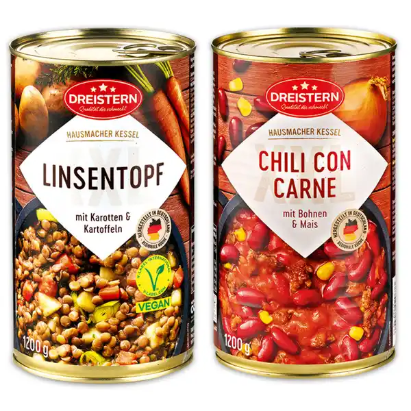 Tomatensuppe, Chili con Carne, veganer Linsen oder Erbsentopf je 1,2 kg (1 kg = 3,16)