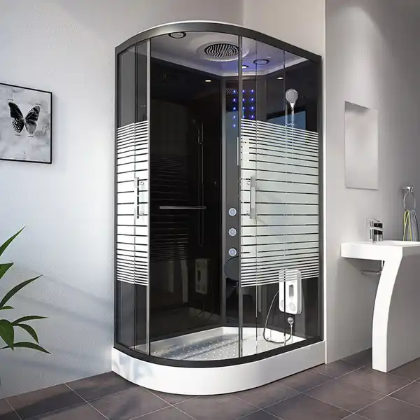 Die Pearl-Serie ist der absolute Hingucker in jedem BadezimmerDiese Design-Duschkabine ist ein wahres Multifunktions- und Raumsparwunder. Die ""Pearl-Serie"" verfügt über die Regenbrausenoption, bei der Wasser wie ein lauwarmer Tropenregen aus den unglaublichen 126 Düsen im Deckenhimmel rieselt. Eine entspannte Rückenmassage (6 Hydrojets) mit gleichzeitigem Lauschen Ihres Lieblingsradiosenders ist bei vielen Kunden beliebt. Selbstverständlich ist auch der gewöhnliche Gebrauch über eine Handbrause, die über die befestigte Duschstange justierbar ist, möglich. Die Handbrause besitzt 3 verschiedene Strahlvarianten, so können Sie sich nach Bedarf die Strahlstärke selbst einstellen. Durch die ergonomische Wannenform, die extra für das Duschen konzipiert wurde, verschwenden Sie keinen Zentimeter Ihres Badezimmers. Die 15 blauen LED-Lichter im Mittelpaneel machen den ""Wohlfühlfaktor"" vollkommen. Über das integrierte Computerdisplay können Sie die Lautstärke und Senderwahl stufenlos regeln. Der im Mittelpaneel aufklappbare Sitz (max. Belastung ca. 100 kg) und die Antirutschstruktur im Wannenboden gewährleisten den sicheren Gebrauch dieser Duschkabine. Sowohl die 5 mm schwarzgetönte ESG-Vollverglasung aller Komponenten als auch die Aluminium-Rahmenkonstruktion stehen für den durchweg hohen Qualitätsstandard. Die hochmoderne Teilsatinierung schafft sowohl Diskretion als auch Lichtdurchlässigkeit. Die auf fast jeden Untergrund anzupassenden höhenverstellbaren Füße der Duschwanne sind ein weiteres herausragendes Feature, das diese Dusche von anderen hervorhebt.Die Black Pearl links ist in vielen weiteren Varianten bei uns bestellbar, z.B. in der spiegelverkehrten rechten Variante.Alles in allem ist die Black Pearl eine sehr gute Duschkabine mit einem herausragenden Preis-/Leistungsverhältnis!Passt diese Duschkabine in einem sanften Weißton besser zu Ihnen? Kein Problem, die White Pearl macht es möglich!PRODUKTBESCHREIBUNGsehr geräuscharmer SchiebelaufSchiebetüren schließen durch die integrierten Magnetleisten bequem und dicht (Soft-Close Mechanismus)Jetzt neu! Mit verbesserter RollenführungBedienelement für Radio-/Lichtfunktion und AbluftAudio-Quelle über eine Bluetooth-Schnittstelle möglichintegrierte Fußmassage als Reflexzonentherapie anwendbarpflegeleichte Oberflächeeinfacher Austausch einzelner Komponenten bei eventuellem Verschleißeinfache Montage und HandhabungLIEFERUMFANGDuschkabine BLACK PEARL 120 x 80 cm Linksflexibler Abwasseranschluss (HT 40 mm als Ziehharmonikaschlauch) wird mitgeliefertBitte beachten: 2x 1/2"" Flexschläuche mit Überwurfmutter werden benötigt (in nahezu jedem ortsansässigen Baumarkt kostengünstig erhältlich)