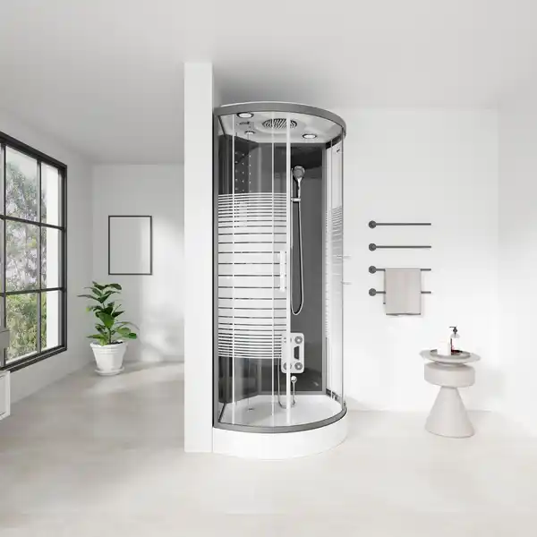 Die Pearl-Serie ist der absolute Hingucker in jedem BadezimmerDiese Design-Duschkabine ist ein wahres Multifunktions- und Raumsparwunder. Die ""Pearl-Serie"" verfügt über die Regenbrausenoption, bei der Wasser wie ein lauwarmer Tropenregen aus den unglaublichen 126 Düsen im Deckenhimmel rieselt. Eine entspannte Rückenmassage (6 Hydrojets) mit gleichzeitigem Lauschen Ihres Lieblingsradiosenders ist bei vielen Kunden beliebt. Selbstverständlich ist auch der gewöhnliche Gebrauch über eine Handbrause, die über die befestigte Duschstange justierbar ist, möglich. Die 15 blauen LED-Lichter im Mittelpaneel machen den ""Wohlfühlfaktor"" vollkommen. Über das integrierte Computerdisplay können Sie die Lautstärke und Senderwahl stufenlos regeln. Der im Mittelpaneel aufklappbare Sitz (max. Belastung ca. 100 kg) und die Antirutschstruktur im Wannenboden gewährleisten den sicheren Gebrauch dieser Duschkabine. Die 5mm schwarzgetönte ESG-Vollverglasung aller Komponenten steht für den durchweg hohen Qualitätsstandard. Die hochmoderne Teilsatinierung schafft sowohl Diskretion, als auch Lichtdurchlässigkeit. Die auf fast jeden Untergrund anzupassenden höhenverstellbaren Füße der Duschwanne sind ein weiteres herausragendes Feature, das diese Duschkabine von anderen hervorhebt.Alles in allem ist die Black Pearl eine sehr gute Duschkabine mit einem herausragenden Preis-/Leistungsverhältnis!Passt diese Duschkabine in einem weichen Weißton besser zu Ihnen? Kein Problem, die White Pearl macht es möglich!PRODUKTBESCHREIBUNG sehr geräuscharmer Schiebelauf Schiebetüren schließen durch die integrierten Magnetleisten bequem und dicht (Soft-Close Mechanismus) Jetzt neu! Mit verbesserter Rollenführung Bedienelement für Radio-/Lichtfunktion und Abluft Audio-Quelle über eine Bluetooth-Schnittstelle möglich integrierte Fußmassage als Reflexzonentherapie anwendbar einfacher Austausch einzelner Komponenten bei eventuellem Verschleiß einfache Montage und HandhabungLIEFERUMFANG Duschkabine BLACK PEARL 90 x 90 cm flexibler Abwasseranschluss (HT 40 mm als Ziehharmonikaschlauch) wird mitgeliefert Bitte beachten: 2x 1/2"" Flexschläuche mit Überwurfmutter werden benötigt (in nahezu jedem ortsansässigen Baumarkt kostengünstig erhältlich)