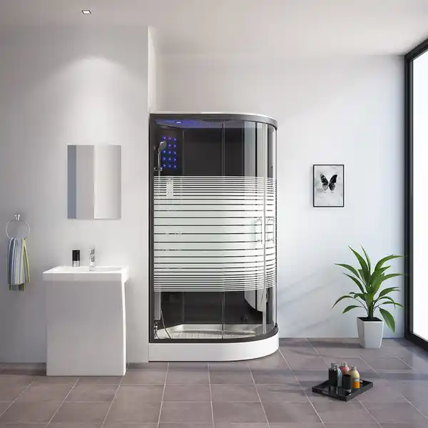 Die Pearl-Serie ist der absolute Hingucker in jedem BadezimmerDiese Design-Duschkabine ist ein wahres Multifunktions- und Raumsparwunder. Die ""Pearl-Serie"" verfügt über die Regenbrausenoption, bei der Wasser wie ein lauwarmer Tropenregen aus den unglaublichen 126 Düsen im Deckenhimmel rieselt. Eine entspannte Rückenmassage (6 Hydrojets) mit gleichzeitigem Lauschen Ihres Lieblingsradiosenders ist bei vielen Kunden beliebt. Selbstverständlich ist auch der gewöhnliche Gebrauch über eine Handbrause, die über die befestigte Duschstange justierbar ist, möglich. Die Handbrause besitzt 3 verschiedene Strahlvarianten, so können Sie sich nach Bedarf die Strahlstärke selbst einstellen. Durch die ergonomische Wannenform, die extra für das Duschen konzipiert wurde, verschwenden Sie keinen Zentimeter Ihres Badezimmers. Die 15 blauen LED-Lichter im Mittelpaneel machen den ""Wohlfühlfaktor"" vollkommen. Über das integrierte Computerdisplay können Sie die Lautstärke und Senderwahl stufenlos regeln. Der im Mittelpaneel aufklappbare Sitz (max. Belastung ca. 100 kg) und die Antirutschstruktur im Wannenboden gewährleisten den sicheren Gebrauch dieser Duschkabine. Die 5mm schwarzgetönte ESG-Vollverglasung aller Komponenten steht für den durchweg hohen Qualitätsstandard. Die hochmoderne Teilsatinierung schafft sowohl Diskretion, als auch Lichtdurchlässigkeit. Die auf fast jeden Untergrund anzupassenden höhenverstellbaren Füße der Duschwanne sind ein weiteres herausragendes Feature, das diese Dusche von anderen hervorhebt.Die Black Pearl rechts ist in vielen weiteren Varianten bei uns bestellbar, z.B. in der spiegelverkehrten linken Variante.Alles in allem ist die Black Pearl eine sehr gute Duschkabine mit einem herausragenden Preis-/Leistungsverhältnis!PRODUKTBESCHREIBUNGsehr geräuscharmer SchiebelaufSchiebetüren schließen durch die integrierten Magnetleisten bequem und dicht (Soft-Close Mechanismus)Jetzt neu! Mit verbesserter RollenführungBedienelement für Radio-/Lichtfunktion und AbluftAudio-Quelle über eine Bluetooth-Schnittstelle möglichintegrierte Fußmassage als Reflexzonentherapie anwendbareinfacher Austausch einzelner Komponenten bei eventuellem Verschleißeinfache Montage und HandhabungLIEFERUMFANGDuschkabine BLACK PEARL 120 x 80 cm Rechtsflexibler Abwasseranschluss (HT 40 mm als Ziehharmonikaschlauch) wird mitgeliefertBitte beachten: 2x 1/2"" Flexschläuche mit Überwurfmutter werden benötigt (in nahezu jedem ortsansässigen Baumarkt kostengünstig erhältlich)