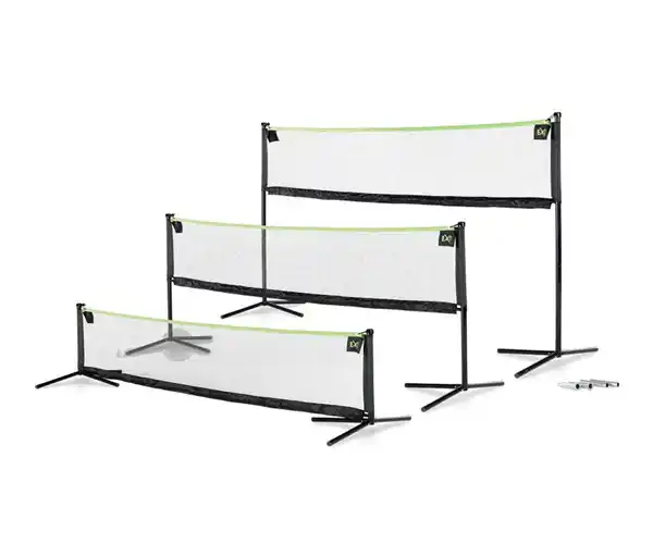 EXIT Multi-Sportnetz »3000« Farbe: Schwarz-lindgrün Material: Rahmen Metall Maße: Breite ca. 300 cm Höhen ca. 62 cm, ca. 109 cm und ca. 155 cm Inhalt: Inkl. Ankersystem, Tragetasche, Montagematerial und -anleitung Gewicht: Ca. 11 kg Sonstige Hinweise: Lieferung in 1 Packstück Garantiegeber: Dutch Toys Group B.V. Herstellergarantie: Rahmen 2 Jahre, sonstige Ersatzteile 3 Monate Garantieumfang: gesamtes Produkt Räumlicher Geltungsbereich: Deutschland und Österreich Hersteller-Artikel-Nummer: 44.01.10.00 Hersteller: Dutch Toys Group B.V., Edisonstraat 83/NL-7006 RB Doetinchem info@exittoys.de Multifunktionales Sportnetz mit 3 einstellbaren HöhenFür viele Sportarten verwendbar, z.B. Tennis, Federball, Beachsoccer oder auch VolleyballEinfaches Verstellen der NetzhöheEinstellbare Höhen: niedrig ca. 62 cm, mittelhoch ca. 109 cm, hoch ca. 155 cm