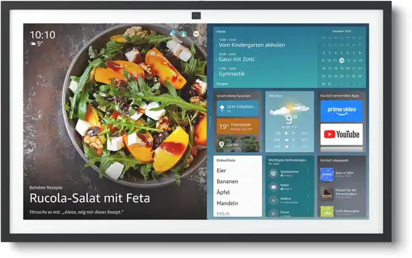 Beeindruckendes 21-Zoll-Smart-Display mit integriertem Fire TV, kraftvollem Klang, immersivem HD-Streaming und Alexa Das neue Herz deines Smart Home – Echo Show 21 hilft dir mit seinem beeindruckenden Display dabei, deinen Tag immer im Griff zu haben, deine To-do-Liste abzuarbeiten, dein Smart Home zu synchronisieren und deine ganze Familie mit Entertainment zu versorgen. Deine Sendungen, deine Musik – dein ideales Zuhause. Hör beim Kochen deine Lieblingspodcasts, schau beim Geschirrspülen eine Sendung ... alle deine Lieblingsinhalte findest du hier. Kraftvoller Klang Mit dem kraftvollen Klang und den klaren Stimmen klingen Serien, Filme und Musik einfach fantastisch. Fire TV integriert Mit Fire TV kannst du Hunderttausende Filme und Serien streamen. Schau mit deinen Abonnements * für Netflix, Prime Video, Disney+, Sky und mehr alle deine Lieblingsinhalte. * Bestimmte Apps und Dienste können jederzeit geändert oder entfernt werden, sind eventuell nicht in allen Ländern, Regionen und Sprachen verfügbar und erfordern möglicherweise separate Abonnements Schnelles Streaming Reibungsloseres Streaming durch die Unterstützung von Wi-Fi 6E, mit höherer Geschwindigkeit, geringerer Latenz und mehr Bandbreite. Aktive-Medien-Dashboard Du kannst Serien, Filme oder Playlists im Handumdrehen in einem anderen Zimmer fortsetzen lassen, Echo-Geräte gruppieren und deine Musik überall in deinem Zuhause abspielen. „Alexa, spiel ‚The Boys‘.“ Mit Alexa-Sprachfernbedienung Mit der mitgelieferten Fire TV-Fernbedienung kannst du mühelos zwischen deinen Lieblingsfilmen und -serien hin- und herschalten. Die Fernbedienung kann nicht dazu genutzt werden, Widgets oder andere Skills auf dem Echo Show 21 zu steuern. Immer perfekt organisiert, und das ganz leicht Mit der anpassbaren Startseite sorgst du dafür, dass deine Familie und dein Tag immer ideal organisiert sind. Nutze dafür einfach die Widgets, die am besten zu deinen Anforderungen passen. Anpassbare Startseite – Personalisiere deine Startseite mit deinem Lieblingswidgets, beispielsweise für den Wetterbericht, die Nachrichten, Listen, Musik und Fotos. Schnell und lecker – Bitte Alexa, dir Rezepte anzuzeigen und Einträge zu deiner Einkaufsliste hinzuzufügen. Persönliche Kalender – Lass dir deine persönlichen Kalender anzeigen und verlinke gemeinsam genutzte Google-, Microsoft- und iCloud-Kalender. Dein ganzes Smart Home ganz einfach synchronisiert Verwalte mit dem Smart-Home-Dashboard mühelos alle deine smarten Geräte direkt von der Startseite aus. Du kannst per Touchscreen Kamera-Feeds anzeigen lassen, das Licht und smarte Steckdosen steuern und vieles mehr. Oder lass Alexa per Sprachbefehl die Steuerung für dich erledigen. „Alexa, starte meinen Tag.“ „Alexa, wer ist an der Haustür?“ „Alexa, zeig mir das Kinderzimmer.“ Kommunikation, neu durchdacht Sei immer im Bild Mit der zentrierten Weitwinkelkamera mit automatischer Bildanpassung, 3,3x-Zoom und Geräuschreduzierung. Sei immer in Verbindung Nutze Drop Ins wie eine Gegensprechanlage zwischen Räumen, oder ruf deine wichtigsten Kontakte per Fingertippen an. Sei immer voll informiert Auch unterwegs kannst du per Live-Video nach deiner Familie, den Haustieren oder deinem Zuhause sehen. Deine Fotos ganz groß Wenn du deinen Echo Show 21 gerade nicht nutzt, ist das Gerät auch ideal als digitaler Bilderrahmen geeignet. Lass Fotoserien im Bilderrahmen-Modus als Vollbild darstellen oder zeige sie mit anderen Inhalten zusammen auf der Startseite an. Eingebauter Datenschutz Du kannst das Mikrofon und die Kamera per Knopfdruck ein- und ausschalten, die integrierte Kameraabdeckung vor die Linse schieben oder ganz einfach deine Sprachaufzeichnungen löschen. So bietet dein Alexa-Erlebnis Transparenz und Kontrolle. Erfahre mehr darüber, wie Alexa und Echo-Geräte funktionieren. Wiederverwertbare Verpackung 99 % der Verpackung dieses Geräts bestehen aus Holzfaserwerkstoffen, die aus verantwortungsvoll bewirtschafteten Wäldern oder recycelten Quellen bezogen wurden. Material Dieses Gerät besteht zu 30 % aus recycelten Materialien. Energie Im Ruhemodus spart das Gerät Energie, außer in bestimmten Situationen. Wir investieren zudem in erneuerbare Energien. Bis zum Jahr 2025 sollte der Ertrag aus dieser Energiequelle dem Stromverbrauch des Geräts entsprechen. Eintauschen und recyceln Dieses Gerät ist auf Langlebigkeit ausgelegt. Wenn du jedoch bereit für eine Verä