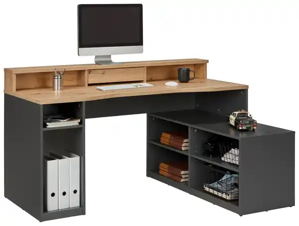 Hausaufgaben, basteln und natürlich arbeiten - mit dem modernen Eckschreibtisch aus Holzdekor wird der Arbeitsplatz zum gemütlichen Workspace mit extra Stauraum. Der L-förmige Tisch punktet neben der ansprechenden Optik vor allem mit Platz für Ordner, Unterlagen und natürlich Monitor oder Laptop. Gleich 8 offene Fächer nehmen Arbeitsmaterial oder Bastelzubehör leicht auf während der Monitoraufsatz für eine freie Arbeitsfläche sorgt. Der etwa 160 x 92,4 x 120 cm (B x H x T) große Eckschreibtisch besitzt zudem einen Kabeldurchlass und ist bis 15 kg belastbar. Besonders die modern, geradlinige Kombination aus Artisan Eiche Dekor und dem anthrazitfarbenen Korpus sorgen für die richtige Atmosphäre am Arbeitsplatz oder im Kinderzimmer.