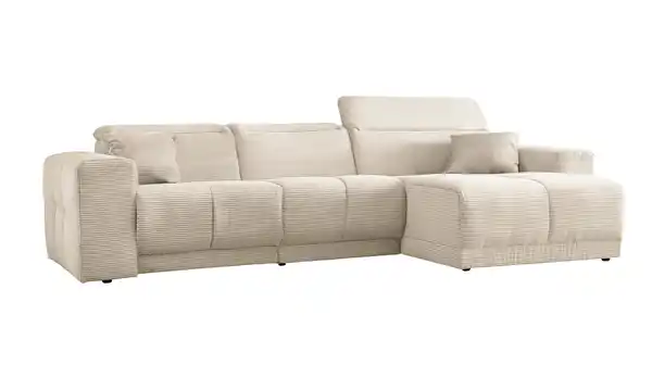 Das Ecksofa TONI wird dank seiner Funktionalitäten und seiner ansprechenden Optik im Handumdrehen zu Ihrem neuen Lieblingsplatz. Der trendige, feingerippte Cordbezug hat eine besonders weiche Haptik und strahlt eine einladende Gemütlichkeit aus. In einem eleganten Beige hat das Sofa dabei eine ganz besondere Präsenz im Raum, ohne jedoch aufdringlich zu sein. Die moderne Optik wird durch die großen Steppungen unterstrichen. Perfekt abgerundet wird das Design dieses Ecksofas durch die schwarzen Füße, die sich harmonisch in das Gesamtbild einfügen. Das Ecksofa TONI zieht garantiert alle Blicke auf sich. Der Rücken ist echt bezogen und ermöglicht es Ihnen, das Sofa auch frei im Raum zu platzieren - ideal für eine offene, individuelle Raumgestaltung.