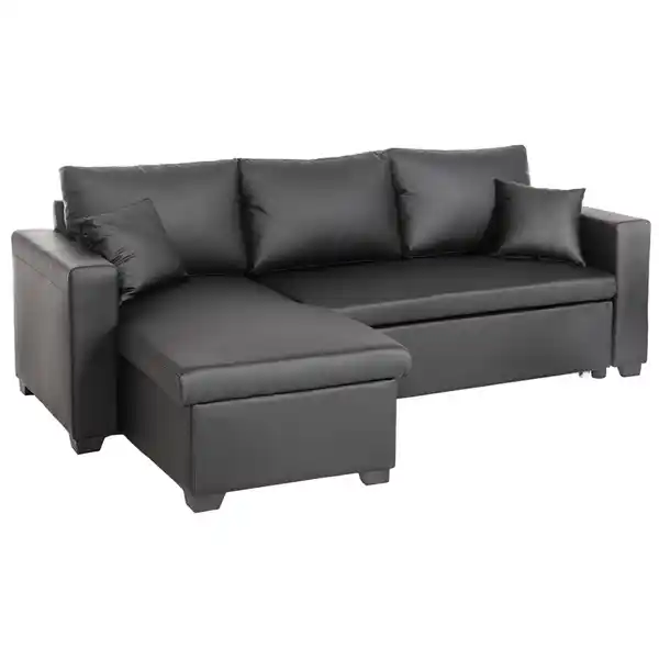 Happy Home Ecksofa mit Stauraum & Schlaffunktion, ca. 223 x 146 x 88 cm - SchwarzMit dem hochwertigen Ecksofa-Set von Happy Home erleben Sie unvergleichlichen Komfort und Entspannung. Dieses Ecksofa lässt sich schnell und mühelos in ein geräumiges, bequemes Bett verwandeln, das Ihre Bedürfnisse nach Erholung perfekt erfüllt. Der Stauraum unter dem Sitz ist clever gestaltet und ermöglicht eine praktische Aufbewahrung von Bettwäsche, Kissen und anderen Dingen, sodass Ihr Wohnzimmer stets ordentlich bleibt. Einfach und elegant: Modernes, minimalistisches Design, das Eleganz und Praktikabilität vereint, um maximalen Nutzen zu bieten. Stabil und langlebig: Robuste Konstruktion, die eine langjährige Nutzung garantiert. Hochwertige Materialien: Ausgewählter PU-Bezug, der herausragende Strapazierfähigkeit mit angenehmem Komfort kombiniert, für ein langanhaltendes Nutzungserlebnis. Flexible Anpassung für höchsten Komfort: Die losen Rückenkissen lassen sich frei verstellen, und sowohl die Sitztiefe als auch die Rückenstütze können individuell angepasst werden, um maßgeschneiderten Komfort zu bieten. Flexible Anordnung nach Wunsch: Die Chaiselongue-Sektion kann je nach Bedarf links oder rechts vom Sofa platziert werden, um sich flexibel an verschiedene Raumgestaltungen anzupassen. Einfache Umwandlung in ein Bett: Entfernen Sie einfach die Rückenkissen und ziehen Sie den Unterrahmen heraus – schon verwandelt sich das Sofa im Handumdrehen in ein geräumiges, bequemes Bett. Farbe Schwarz Maße Ca. 223 x 146 x 88 cm Verpackungsmaße Colli 1/2: 128x86x58,5 cm Colli 2/2: 147x73x41 cm Nettogewicht/Bruttogewicht Colli 1/2: 52,6 kg / 57,7 kg Colli 2/2: 38 kg / 42,2 kg Hinweise Keine scharfen Haushaltsreiniger verwenden Leichte Verschmutzungen mit feuchtem Baumwolltuch abwischen