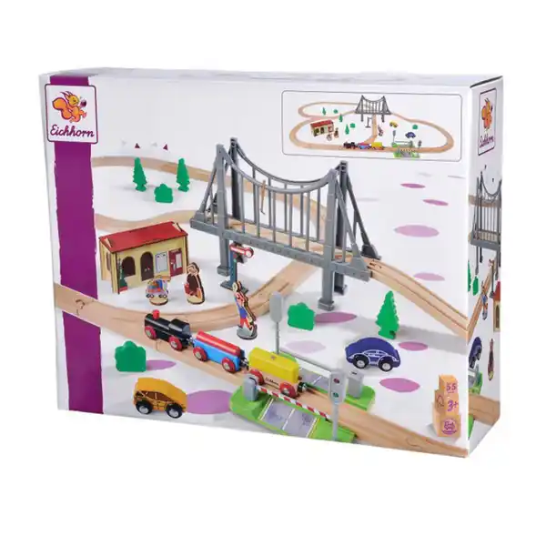 Eichhorn - Holz-Bahnset mit Brücke und E-Lok - 56-tlg.