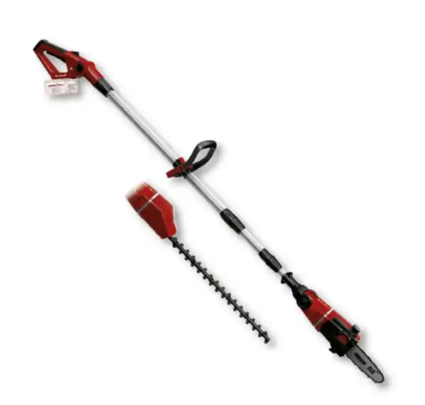 Heckenschere und Kettensäge in einem, stufenloser Teleskopstiel, Schwertlänge Kettensäge: 20 cm/Heckenschere: 40 cm (o. Akku)