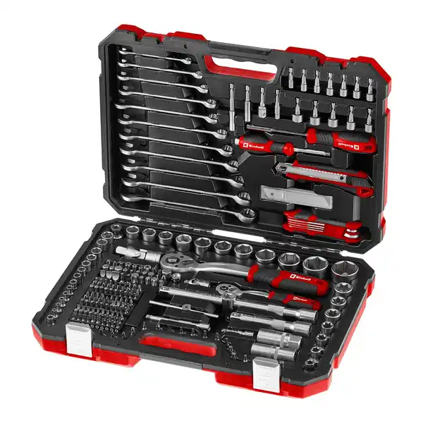 Dank der durchdachten Zusammenstellung und der robusten Materialien ist der Werkzeugkoffer bestens geeignet für Arbeiten an Fahrzeugen, Maschinen, Möbeln und im Haushalt. Die Werkzeuge sind auf die Verwendung mit Knarren, Schraubendrehergriffen und Bitaufnahmen mit 6 mm (1/4") oder 13 mm (1/2") Vierkant ausgelegt und bieten Heimwerkern ein zuverlässiges und langlebiges Arbeitsmittel.