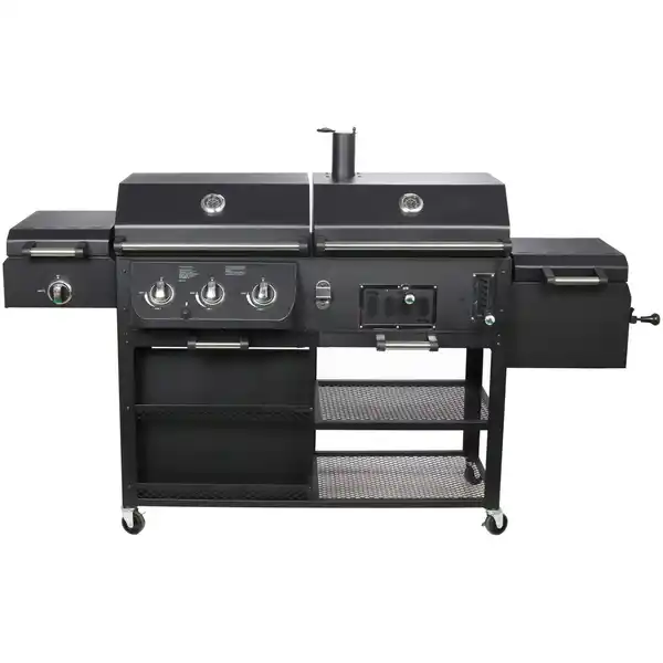 Holzkohlegrill und Gasgrill in einem Gerät|3+1 Brenner mit 9,35 kW Gesamtleistung|mit Grillrost und Grillplatte|mit Infrarotbrenner zum Angrillen|inklusive Gasschlauch und Gasdruckminderer; Freust du dich auch schon darauf, bei strahlendem Sonnenschein im Freien köstliche Speisen für deine Lieben zuzubereiten? Dann ist der Kombigrill 'Arizona' von El Fuego genau das, was du brauchst! Er kann sowohl mit Gas als auch Holzkohle betrieben werden, je nachdem, ob dir eine einfache Bedienung oder das klassische Grillaroma wichtiger ist. Die Grillfläche von 108 x 42 cm bietet viel Platz für das Grillgut, während der 52 x 20 cm große Warmhalterost deine Leckereien warmhält, bis alle zum Schlemmen bereit sind. Der Grillrost besteht aus Gusseisen, das eine hervorragende Wärmeverteilung bietet und deinen Grillgenuss verstärkt. Außerdem ist der Kombigrill fahrbar und mühelos transportierbar. Mach dich jetzt bereit für unvergessliche Grillabende!