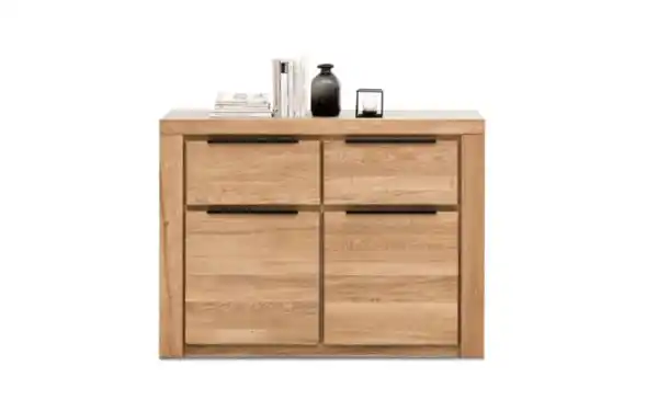 Ausführung mit Front aus Eiche massiv mit durchgehenden Lamellen, 2 Türen, 2 Schubkästen, Griffe in schwarz,