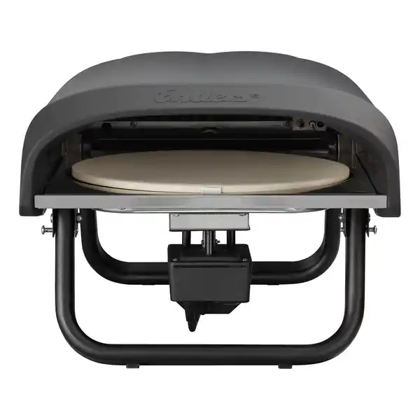 stufenlos regulierbarer Edelstahlbrenner|großer, rotierender Cordierit-Pizzastein|zuschaltbarer Motorbetrieb für eine gleichmäßige Rotation|doppelwandig-isoliertes Gehäuse mit seitlich integriertem Thermometer;