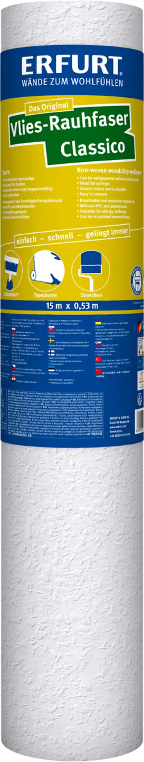 Die Rauhfaser für Leute, die sich das tapezieren deutlich erleichtern wollen. Vlies-Rauhfaser kann ganz einfach in Wandklebetechnik verarbeitet werden: Wand ein-kleistern, Vlies-Rauhfaser drauf, fertig! Aus schadstoff- und allergenkontrollierten Rohstoffen hergestellt, bilden die verschiedenen Strukturen so eine ideale Grundlage für die einfache, individuelle und wohngesunde Wandgestaltung in Ihrem Zuhause. Beachten Sie auch das Video!Maß: Rolle 15 x 0,53 mFarbton: weißMaterial: Vliesideale Grundlage für eine individuelle und wohngesunde Wandgestaltungkeine Weichzeiten, dimensionsstabil, restlos trocken abziehbareinfach, schnell und sauber: Kleister direkt auf die Wand rollen, Tapetenrollen trocken einlegenHerstellerinformationen: ERFURT + SOHN KG | Hugo-Erfurt-Str. 1 | 42399 Wuppertal, DEUTSCHLAND | eMail: info@erfurt.com | Herstellernr. 1000316